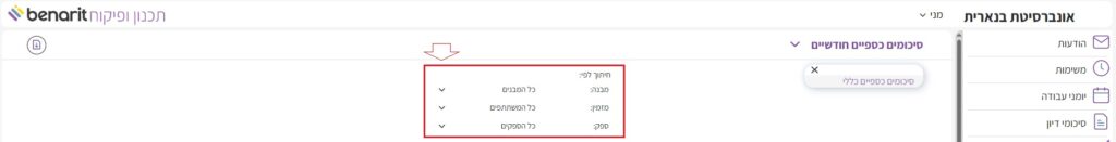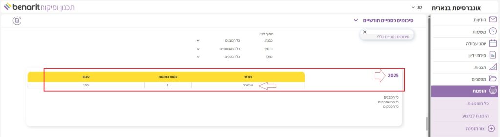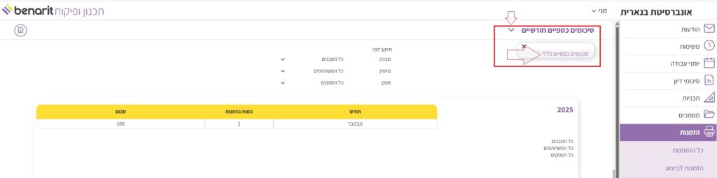 3. ניתן לבחור את אופן הצגת הסיכומים הכספיים: לפי מזמין, לפי ספק, או לפי חודשים. כדי לשנות את התצוגה יש ללחוץ בכותרת הסיכומים על “סיכומים כספיים חודשיים” ואז על “סיכומים כספיים כללי”: