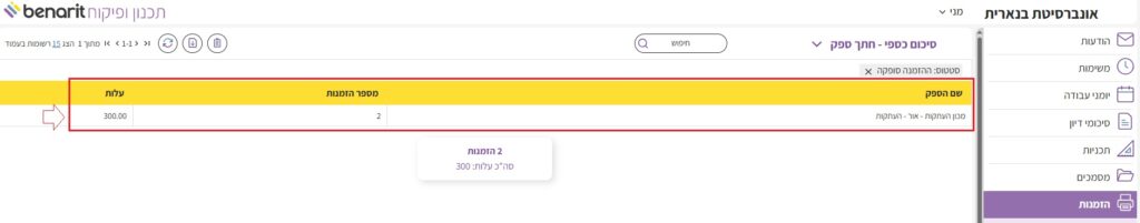 מנהל הפרויקט יכול לעיין בסיכומיים כספיים של הזמנות ממכוני העתקות כדי לעשות בקרה על עלות ההזמנות שסופקו.